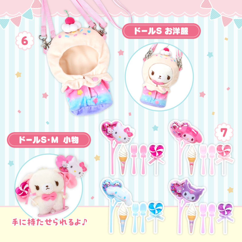 | ラインナップ | 1.ぬいどりドールS(全3種)・・・各2,420円 2.きせかえお洋服S クマパーカー・・・1,540円 3.きせかえお洋服S コック・・・1,540円 4.きせかえお洋服S ワンピース・・・1,540円 5.きせかえお洋服S ドレス・・・1,540円 6.きせかえお洋服S アイスショルダー・・・1,980円 7.小物セット(全4種)・・・各1,870円 |